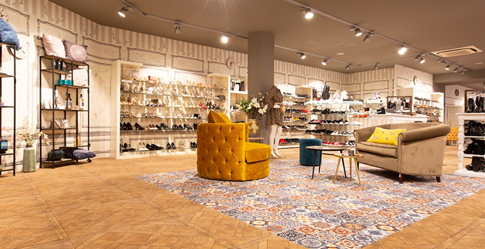 Textile Flächen als Designelement für Verkaufsräume. Individuelle Muster für Markenidentität. Zonierung von Produktbereichen ohne bauliche Eingriffe.